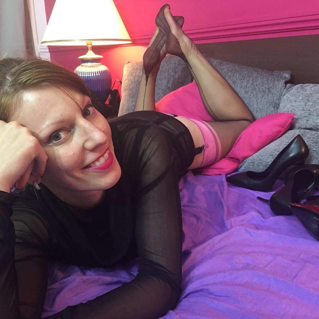 Hot Babe Anett Larman in sexy nylon stockings solo