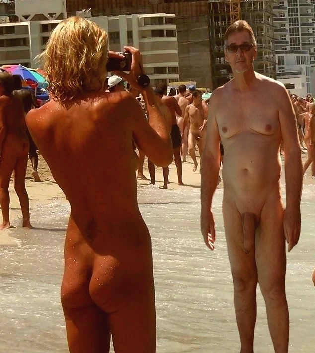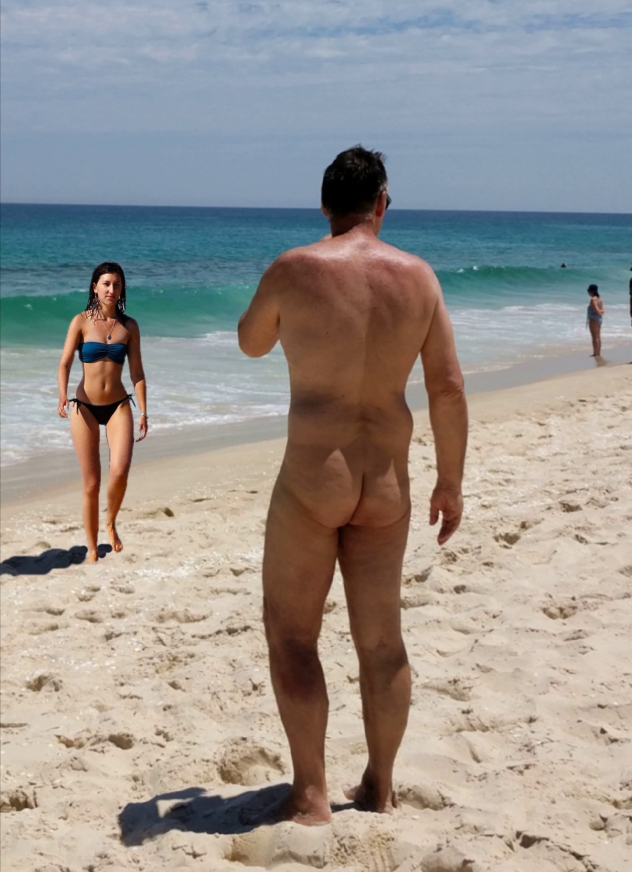 Stunning young nudist friends relax at the beach and enjoy the sun