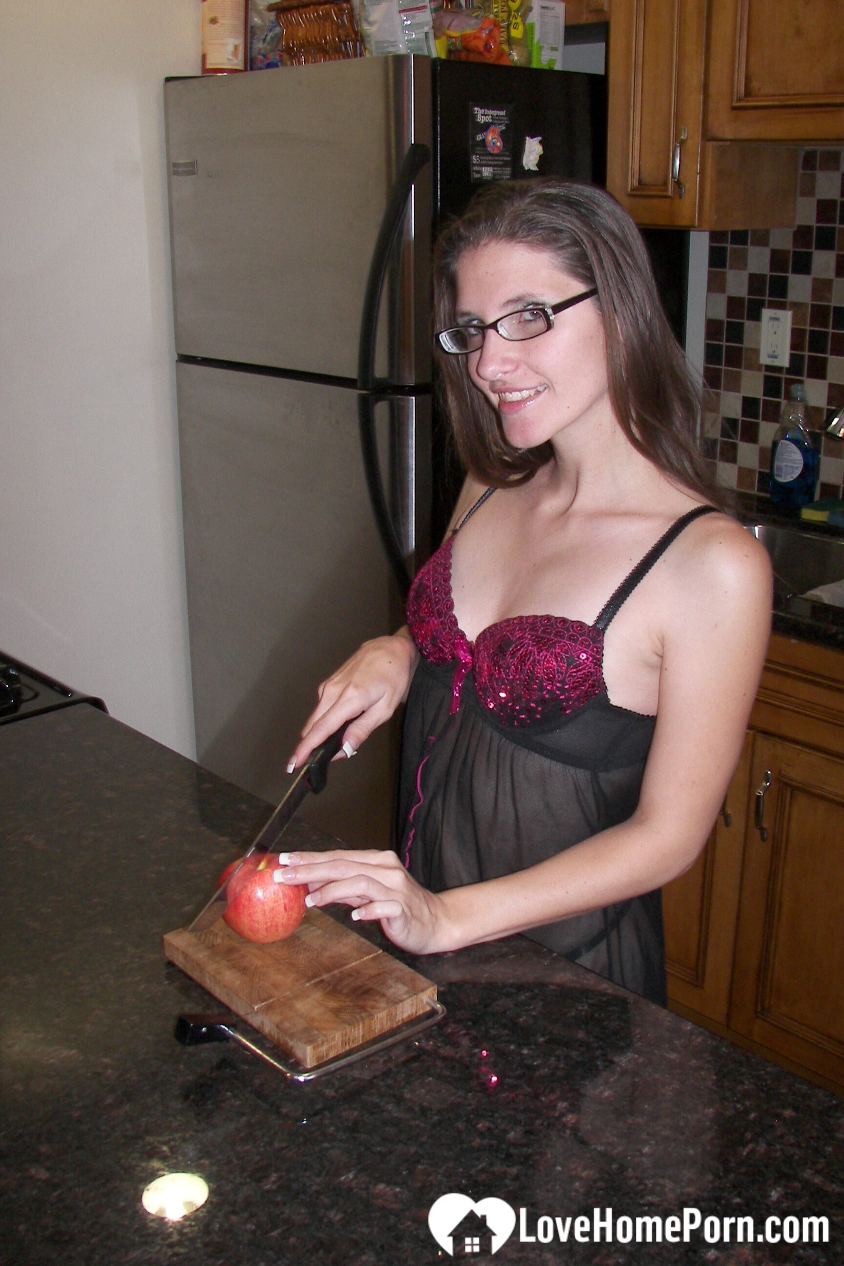 Upon penetrating my tight wet pussy, I make him eat an apple from my foot.