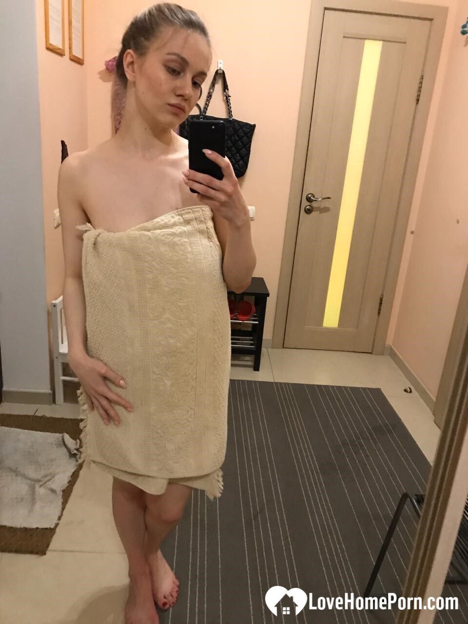 Beauty with the perfect big tits shows off her curves in the mirror.