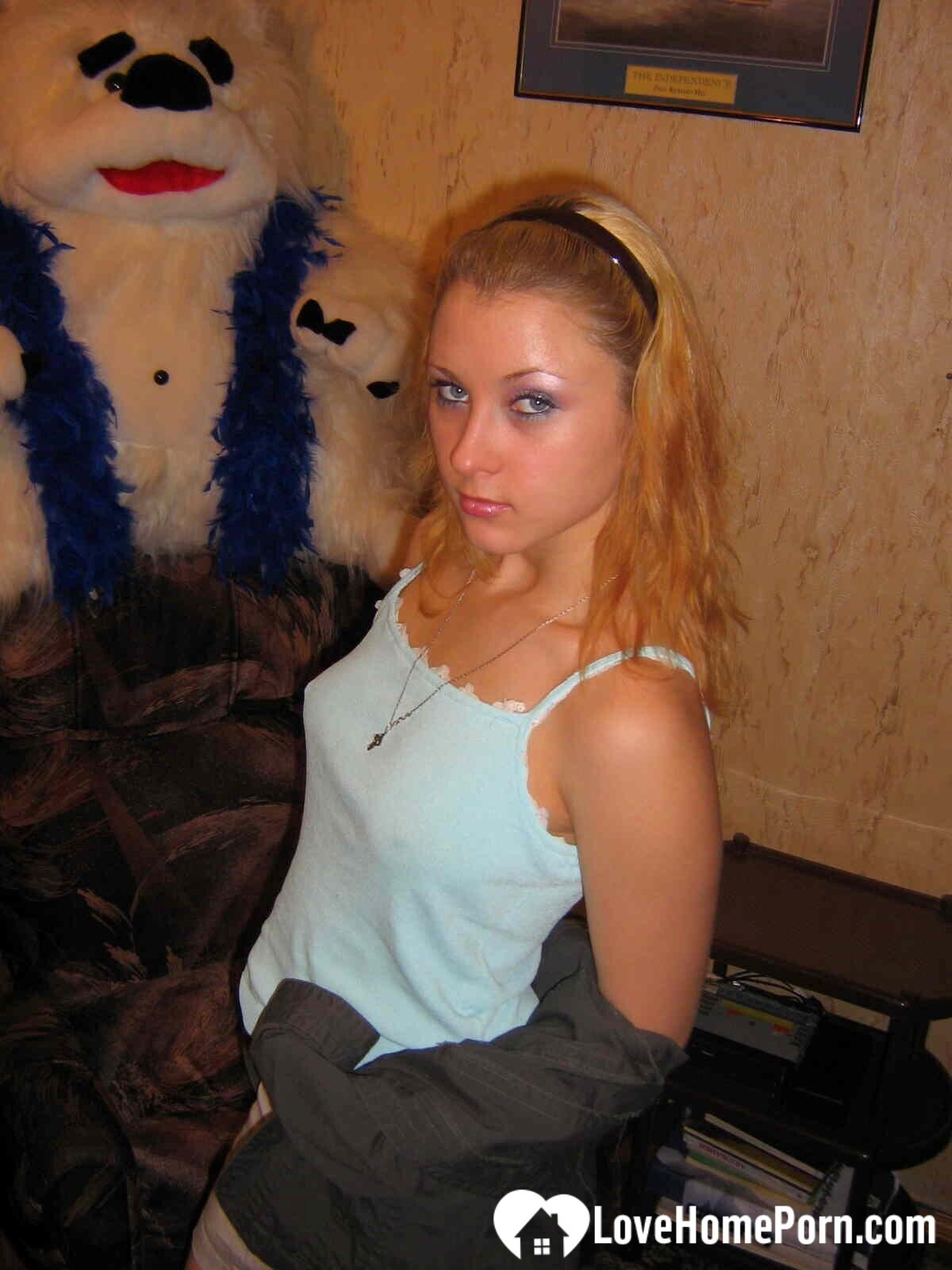 Blonde beauty has fun stripping her clothes off
