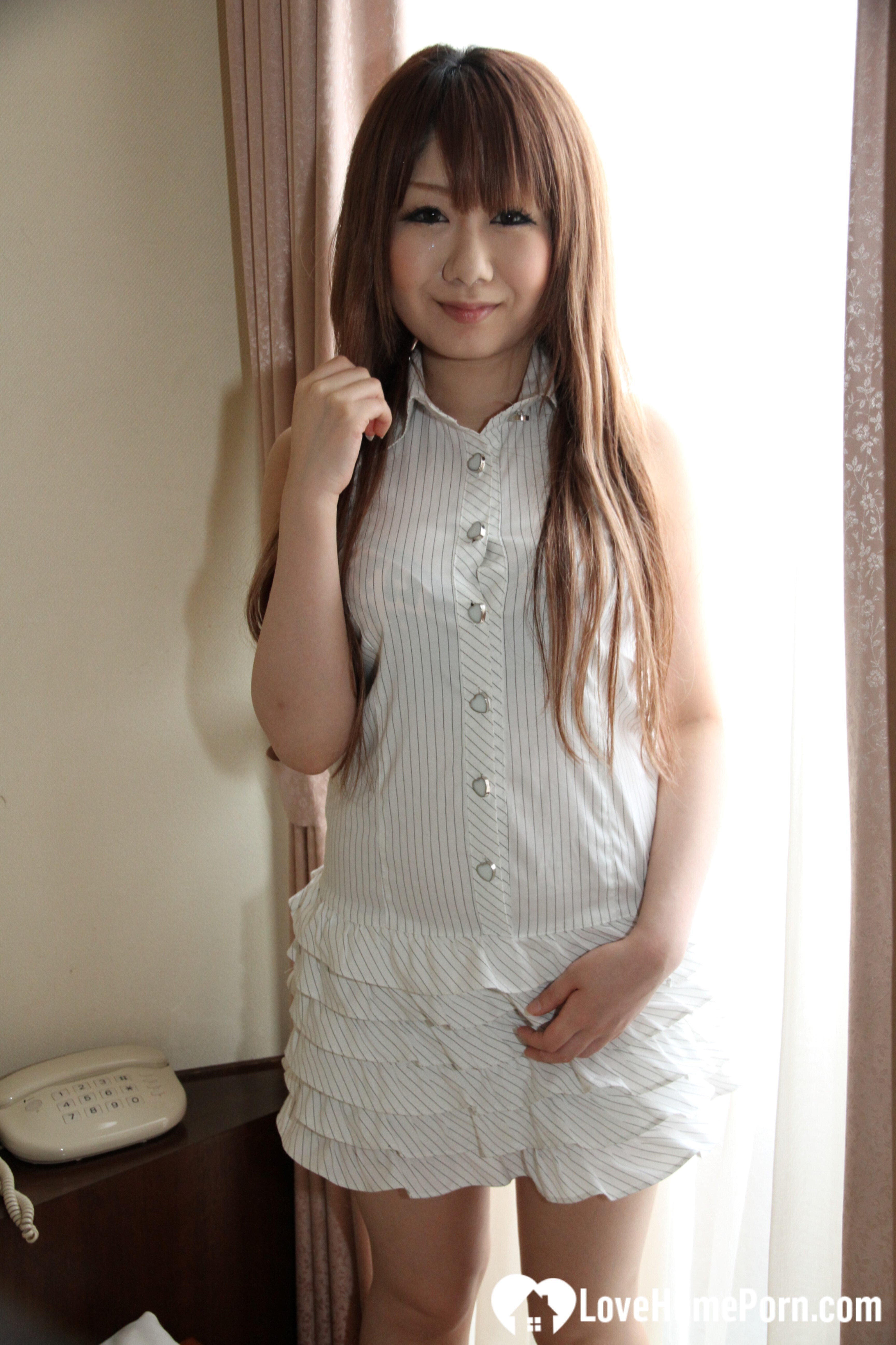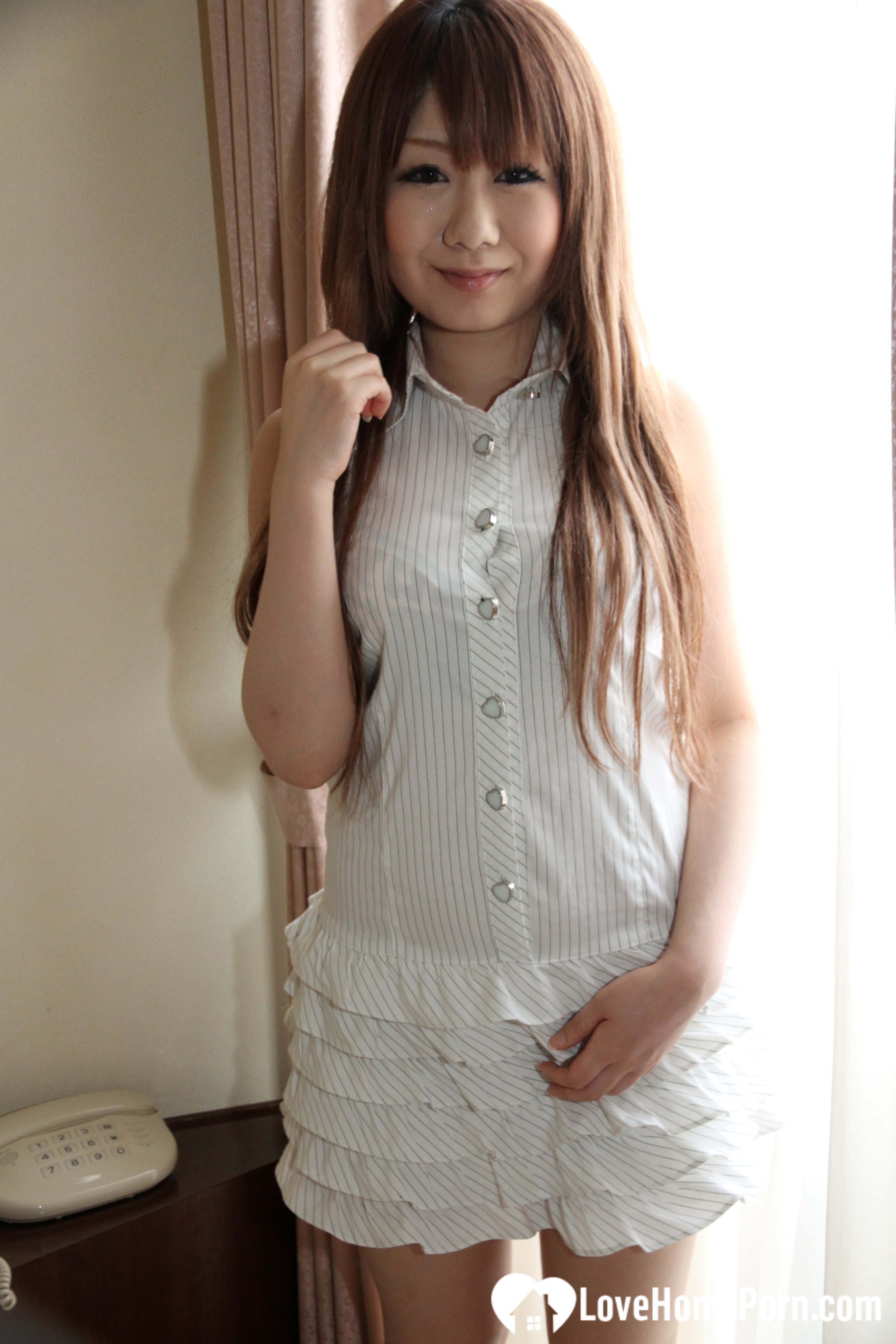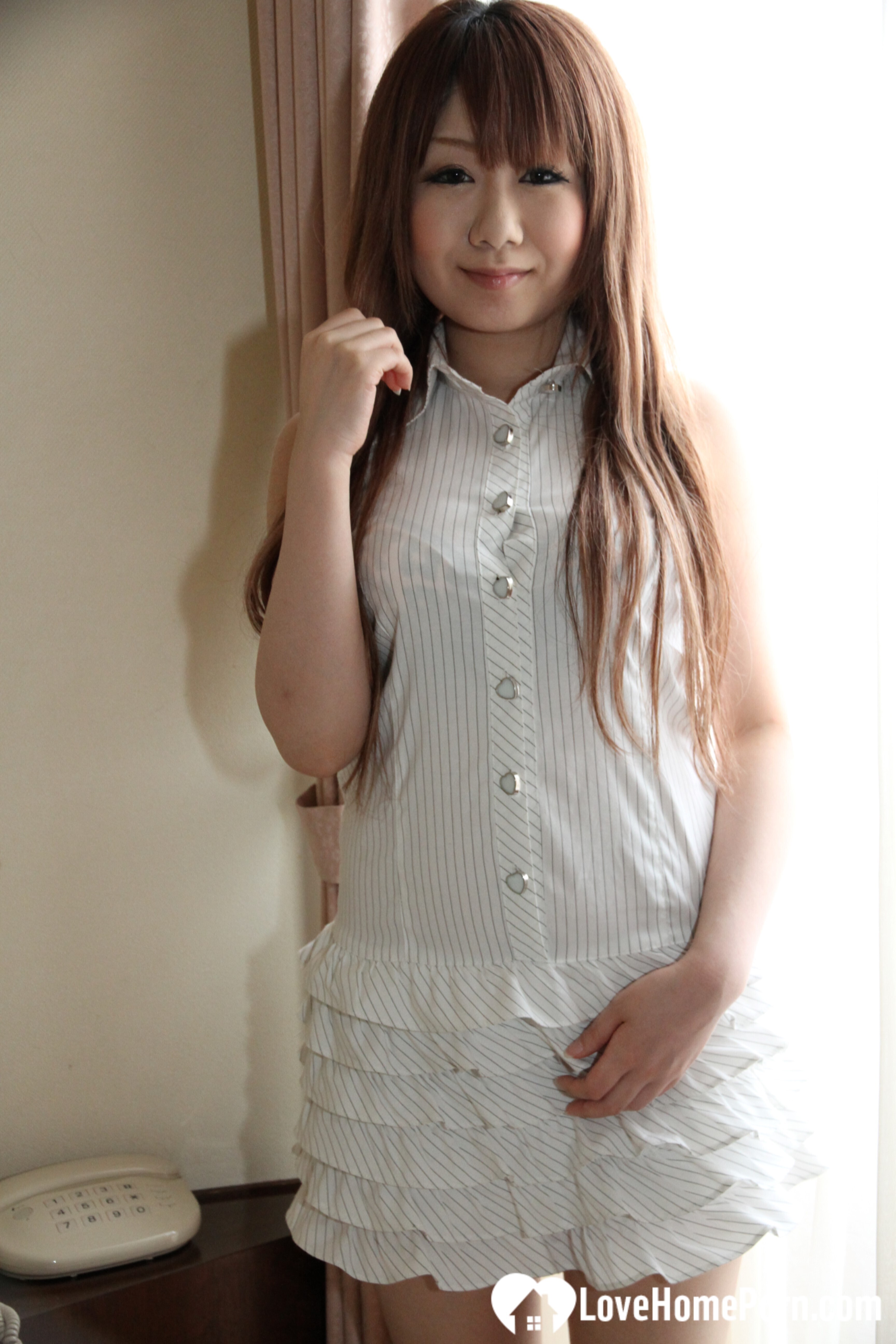 Brunette Asian MILF strips off her white dress and poses naked on the bed.