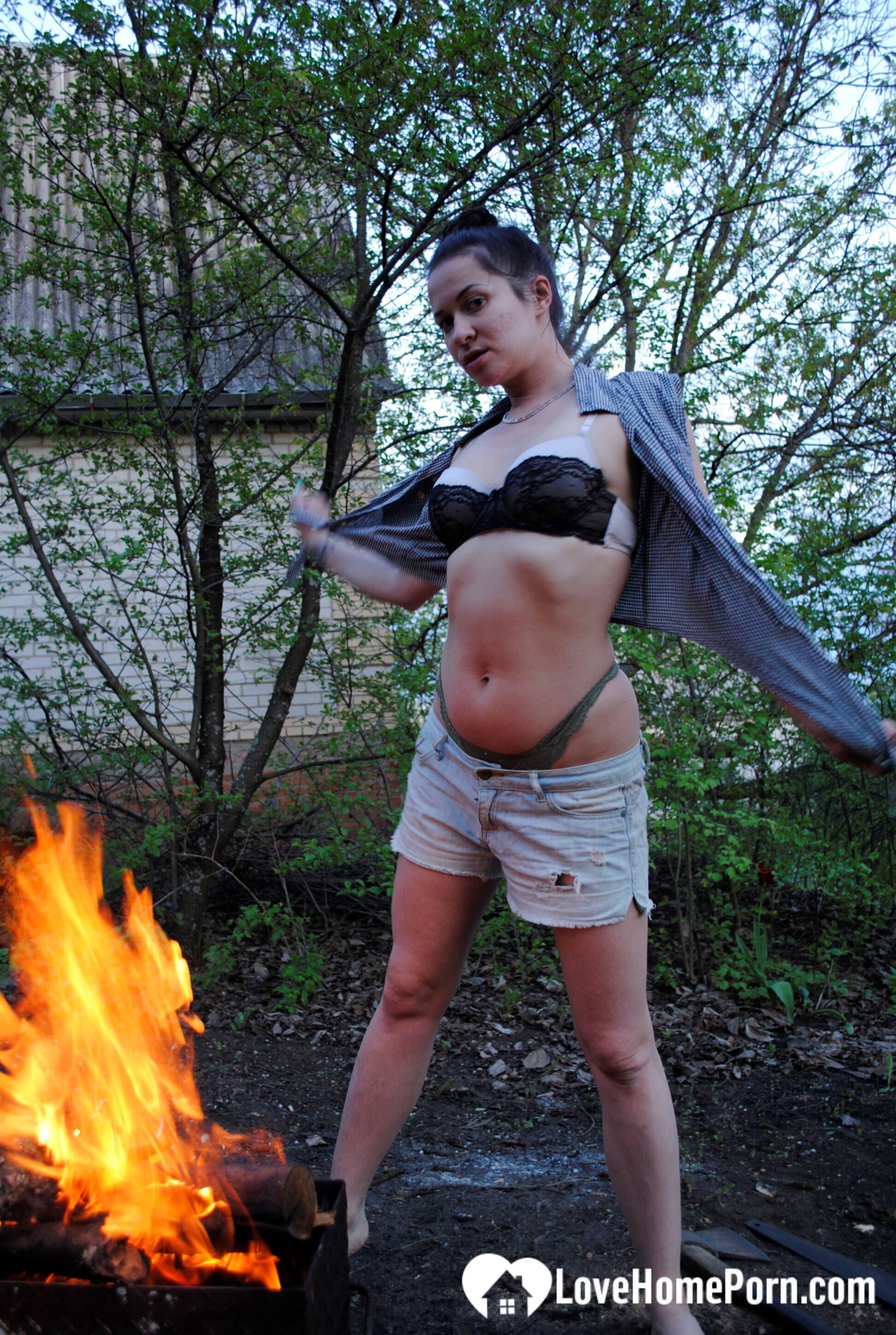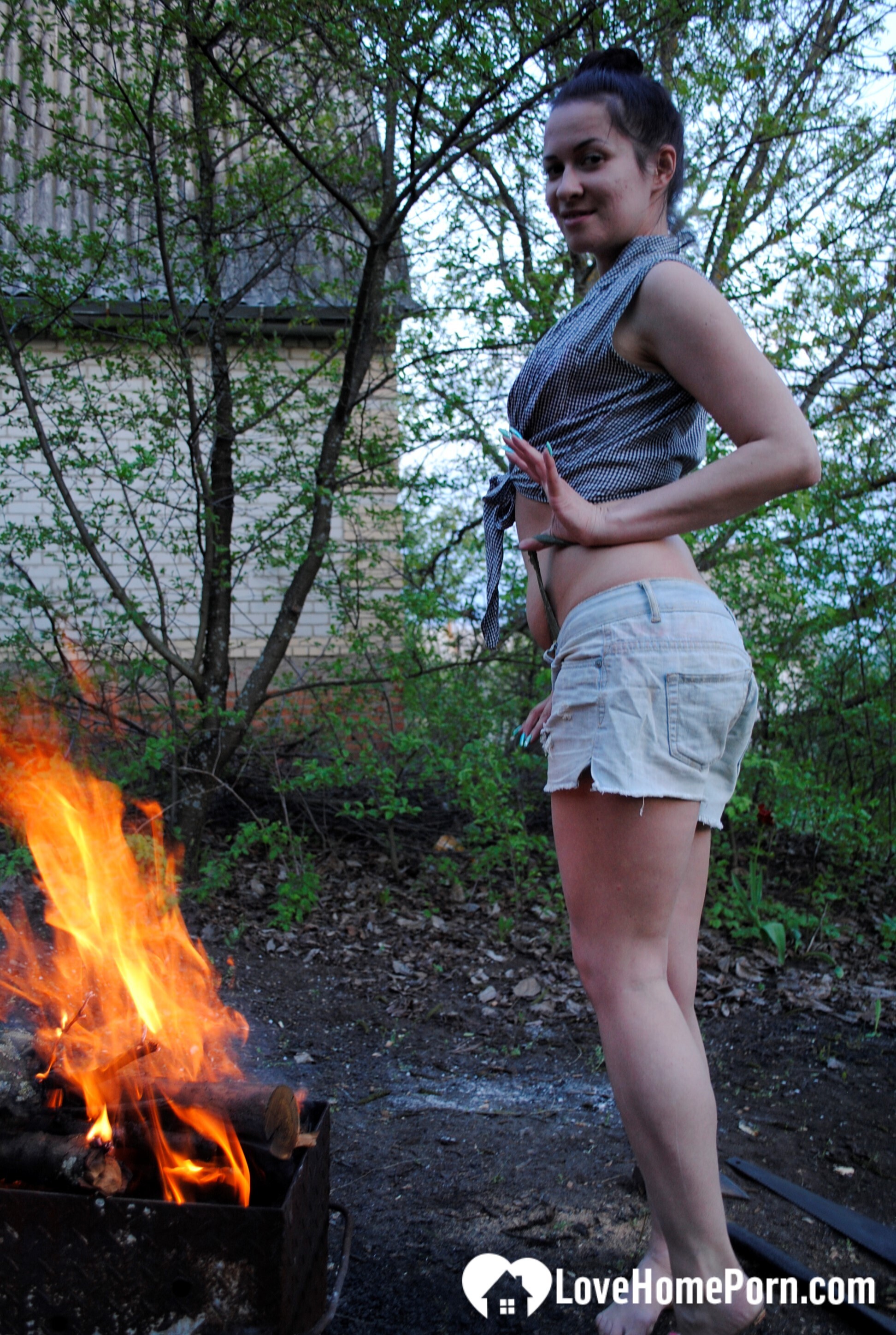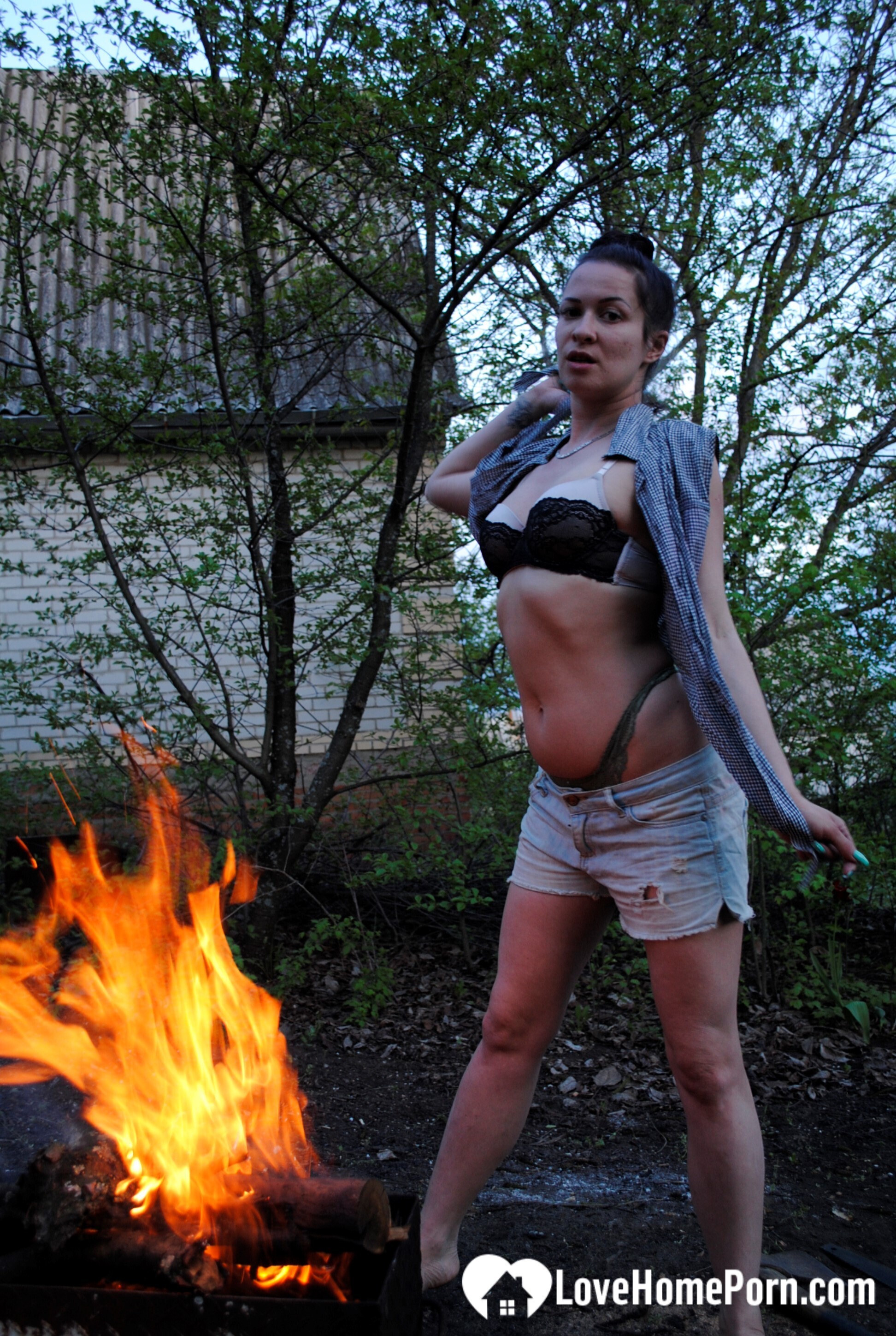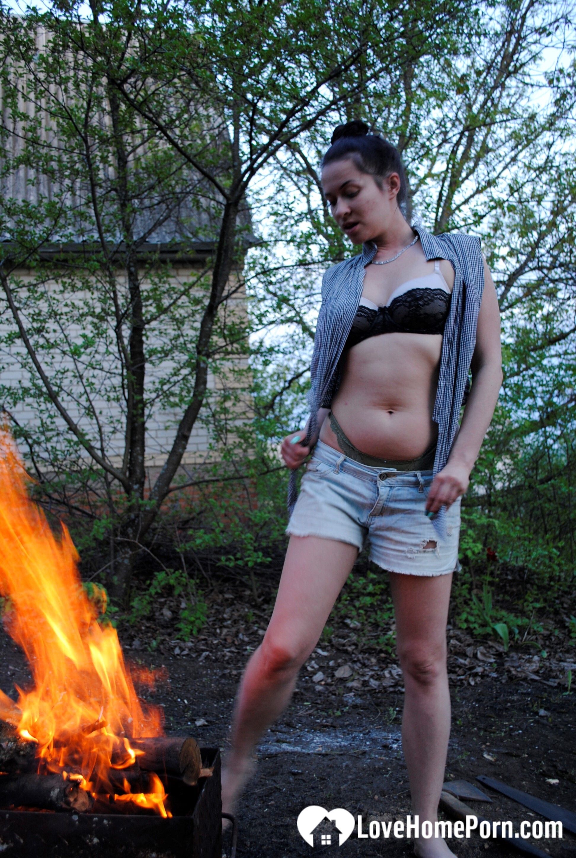 The fire was quite warm, so my girlfriend decided to strip off her clothes.