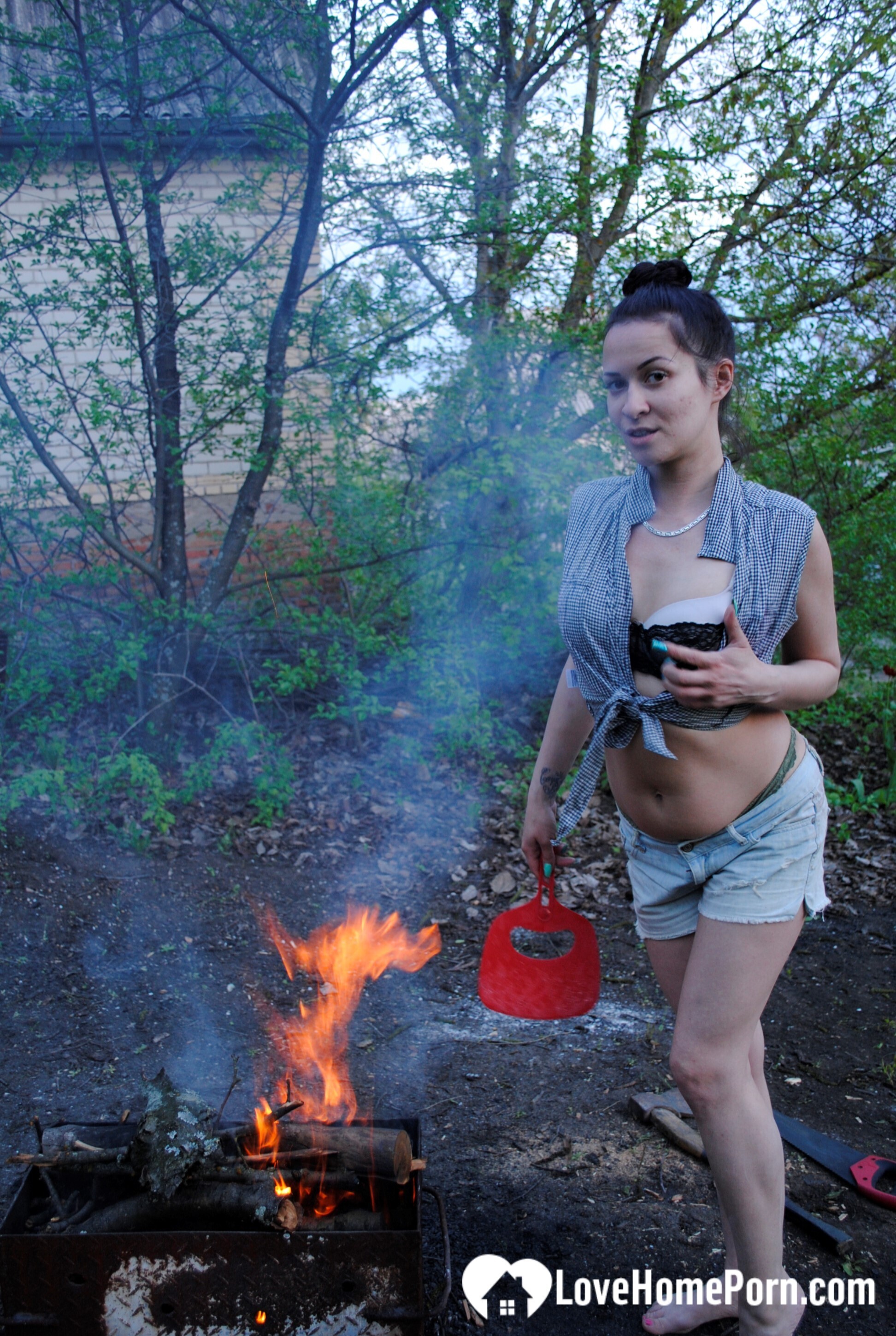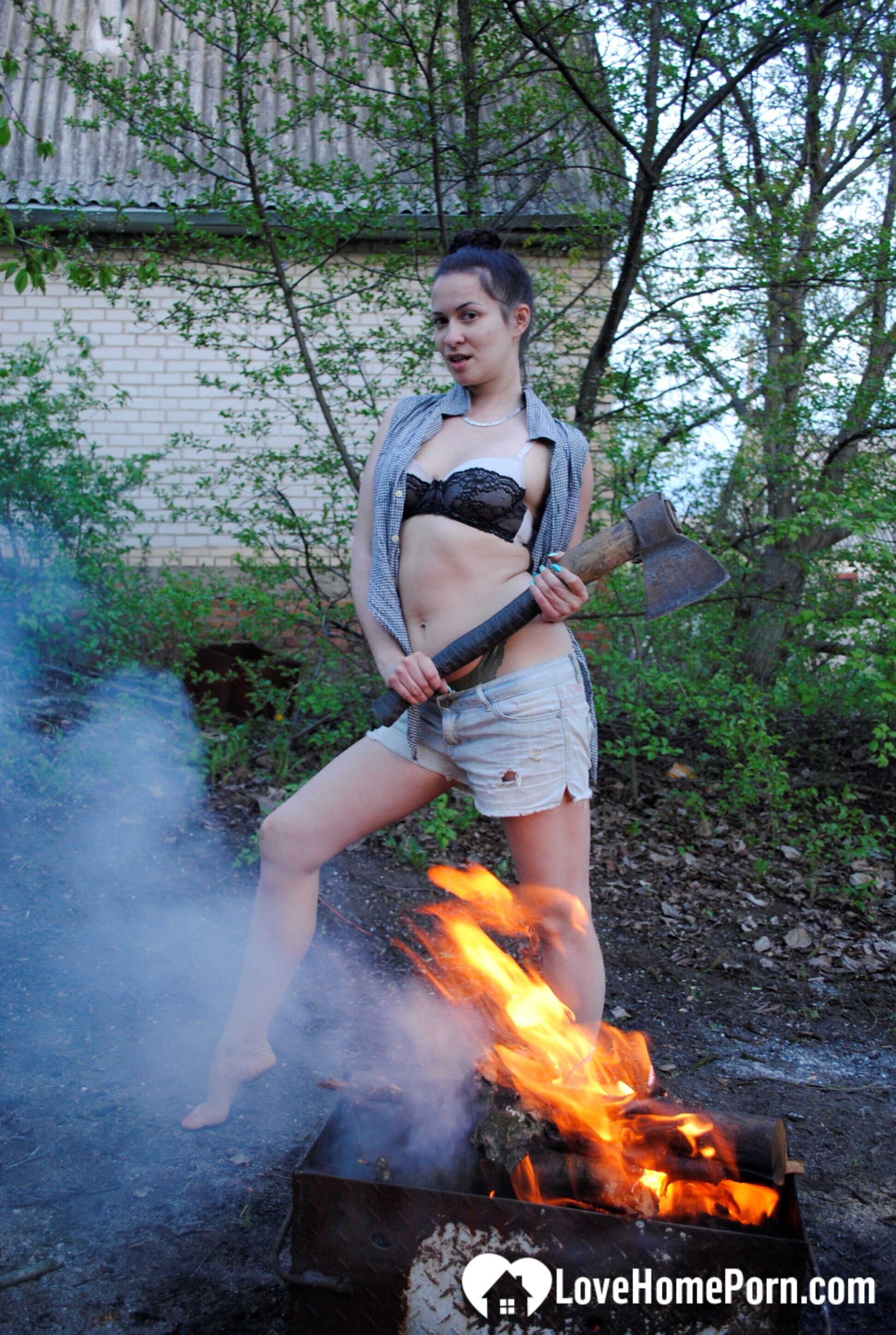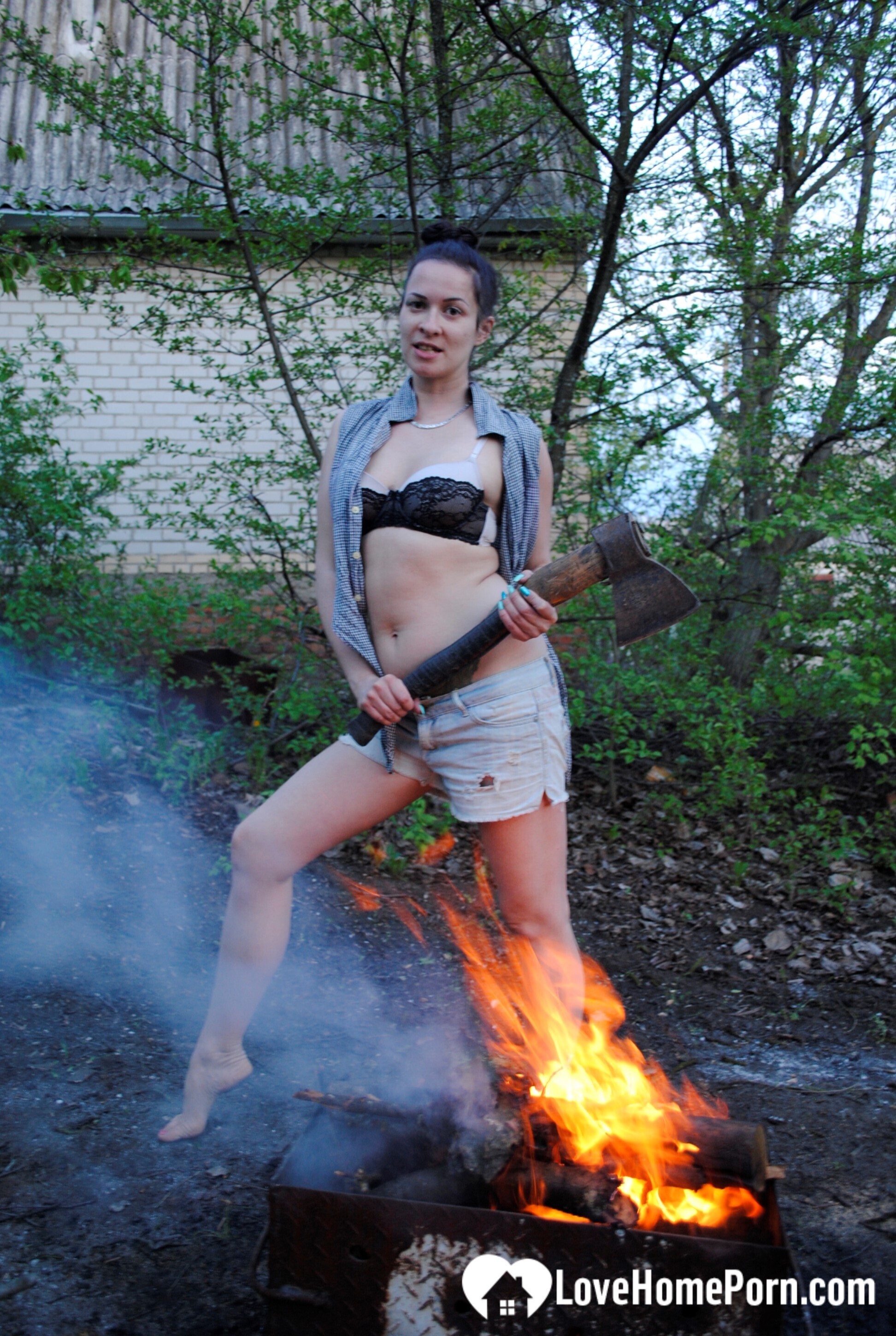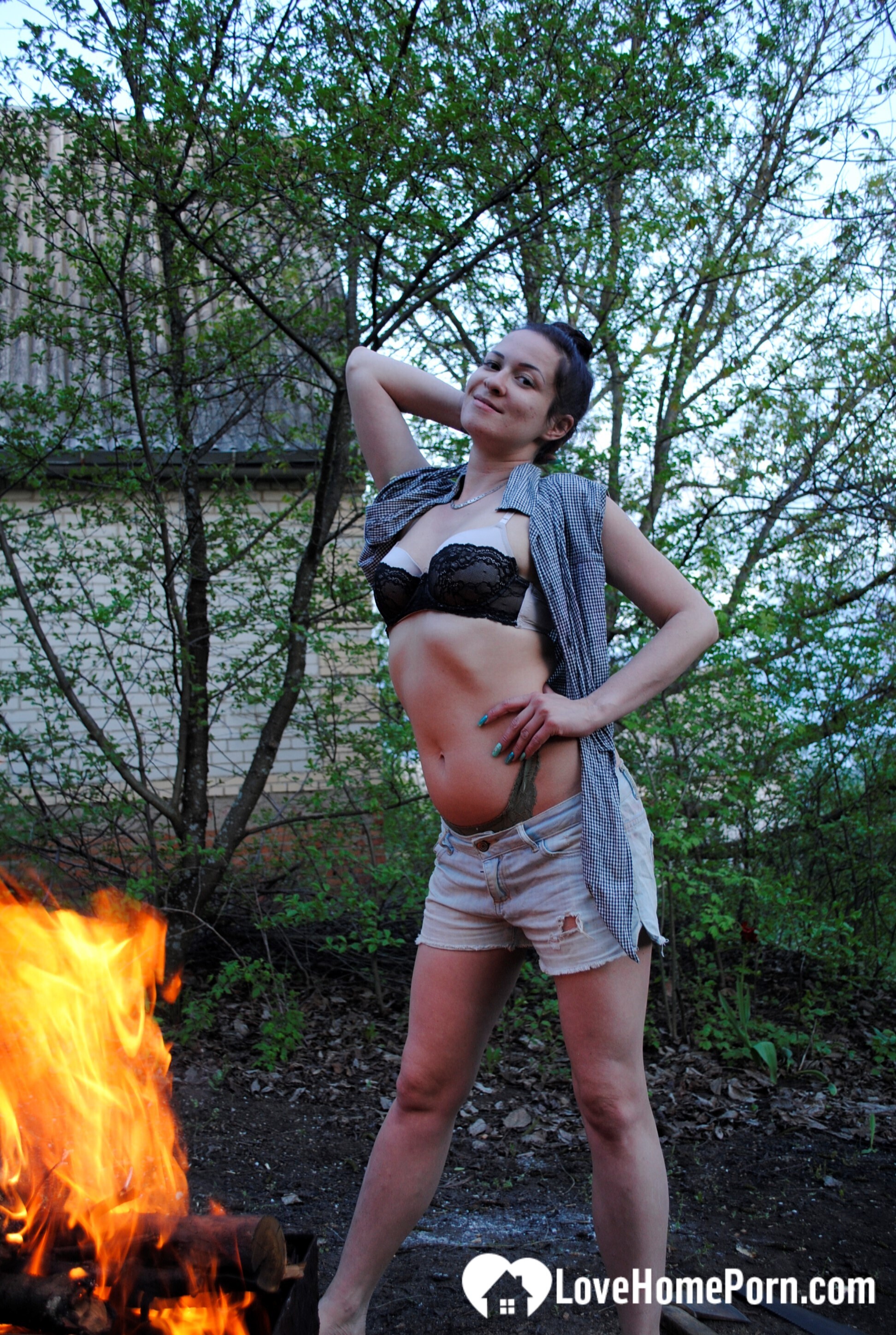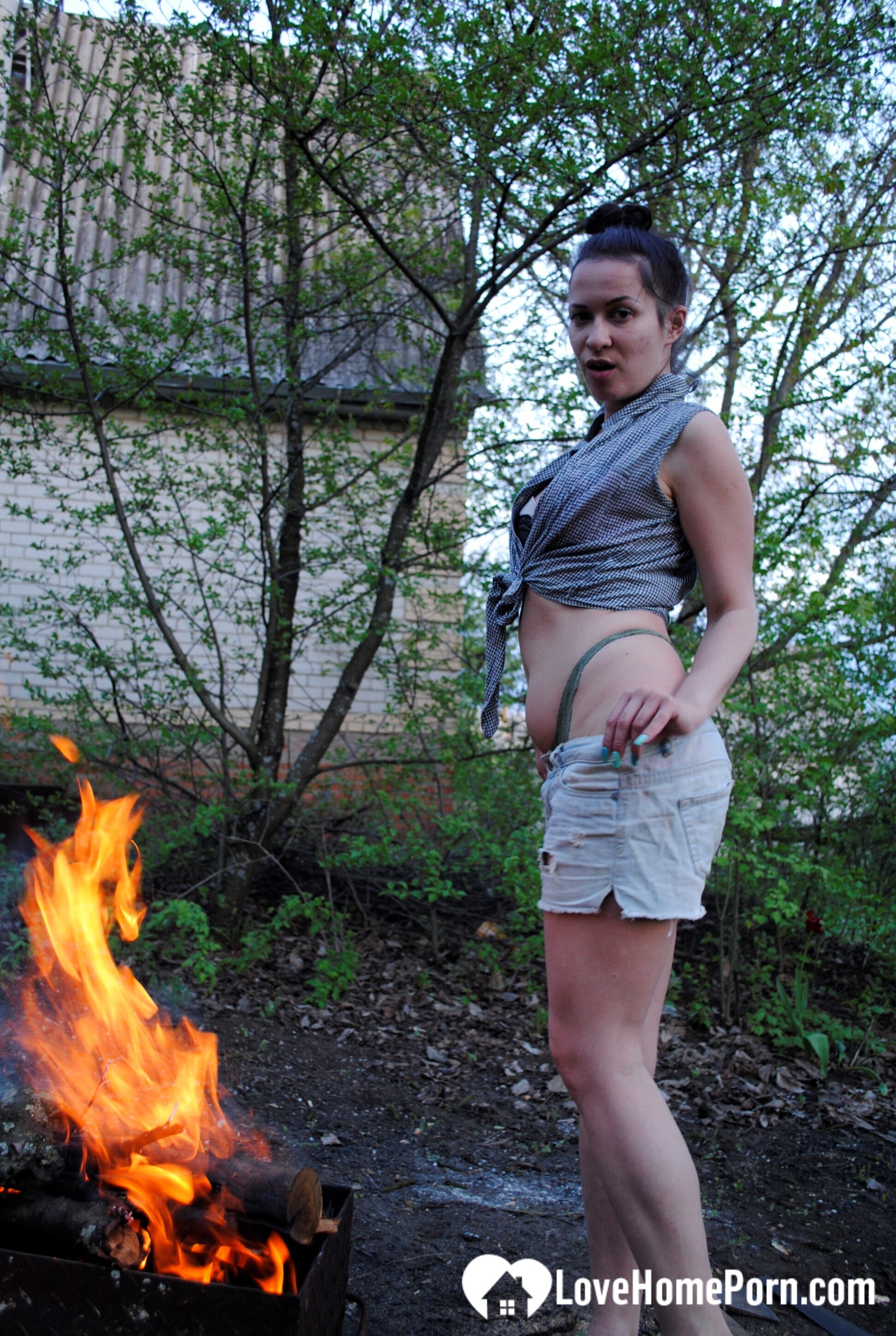 The fire was quite warm, so my girlfriend decided to strip off her clothes.