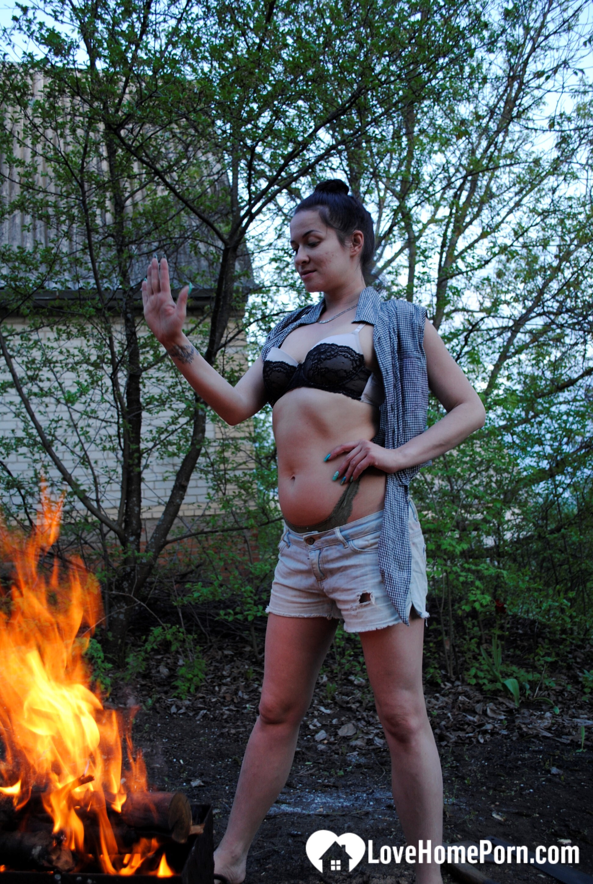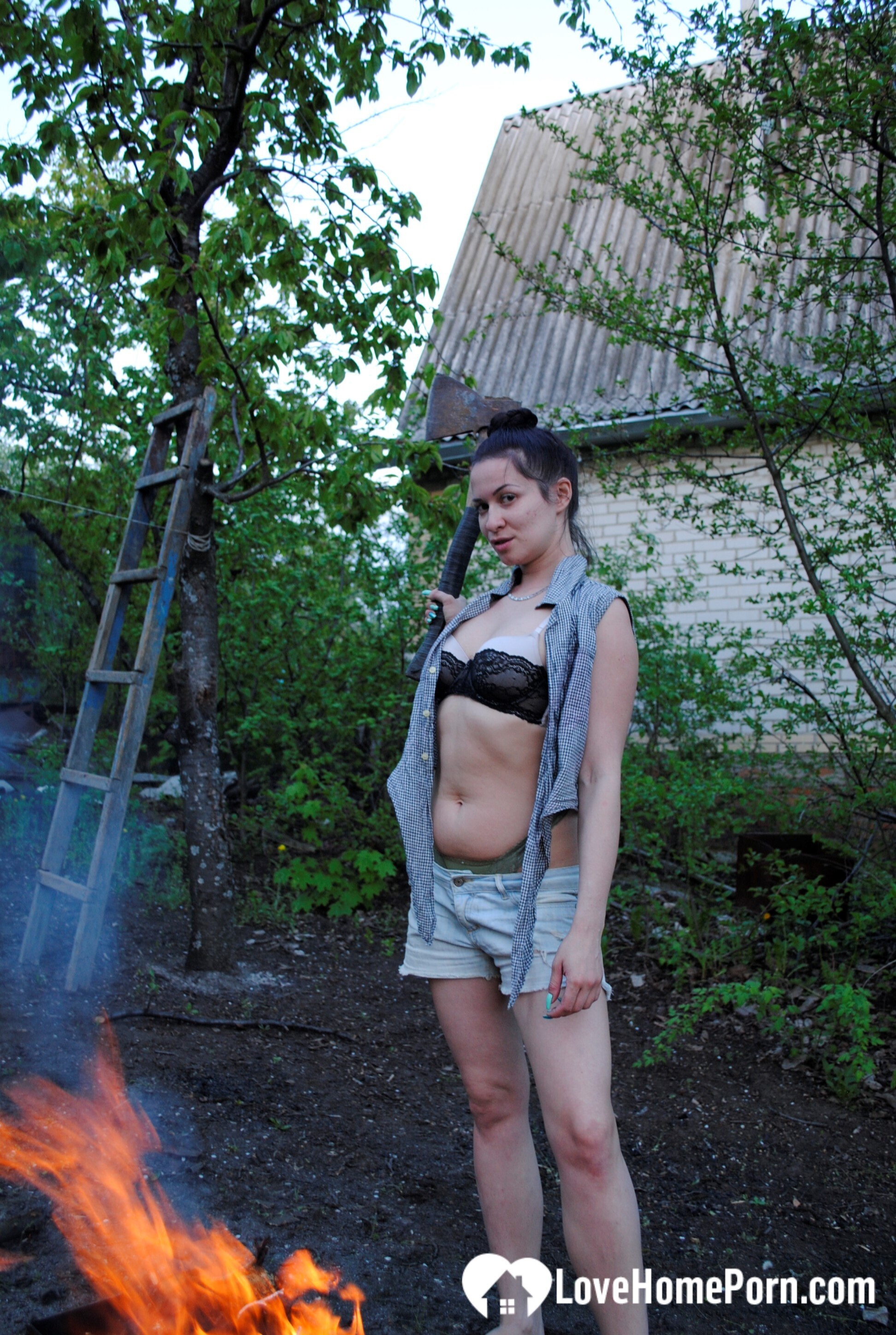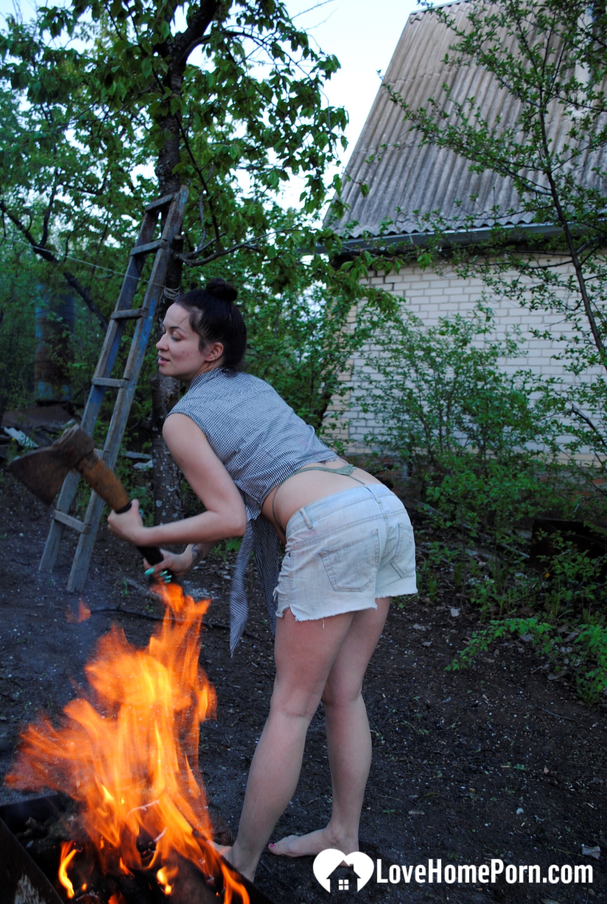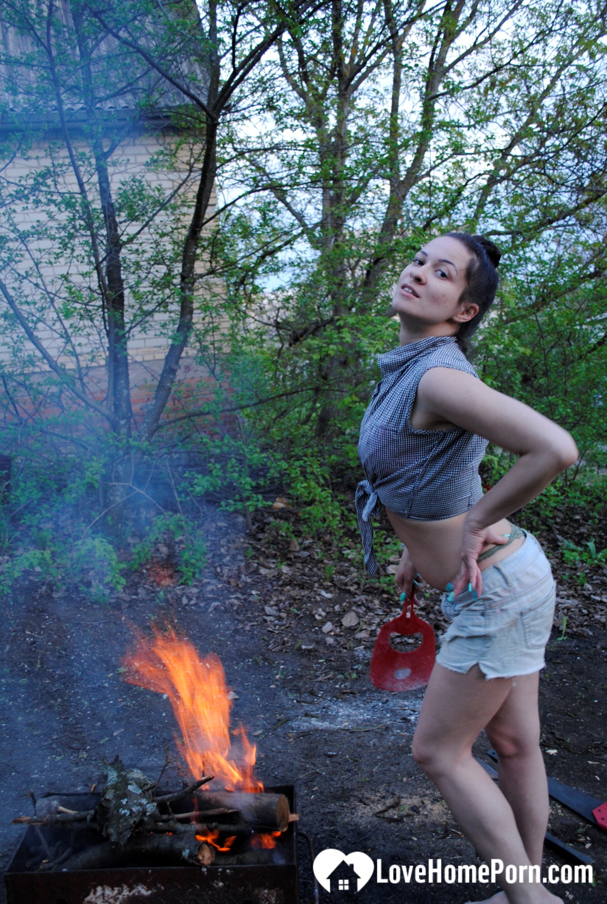 The fire was quite warm, so my girlfriend decided to strip off her clothes.