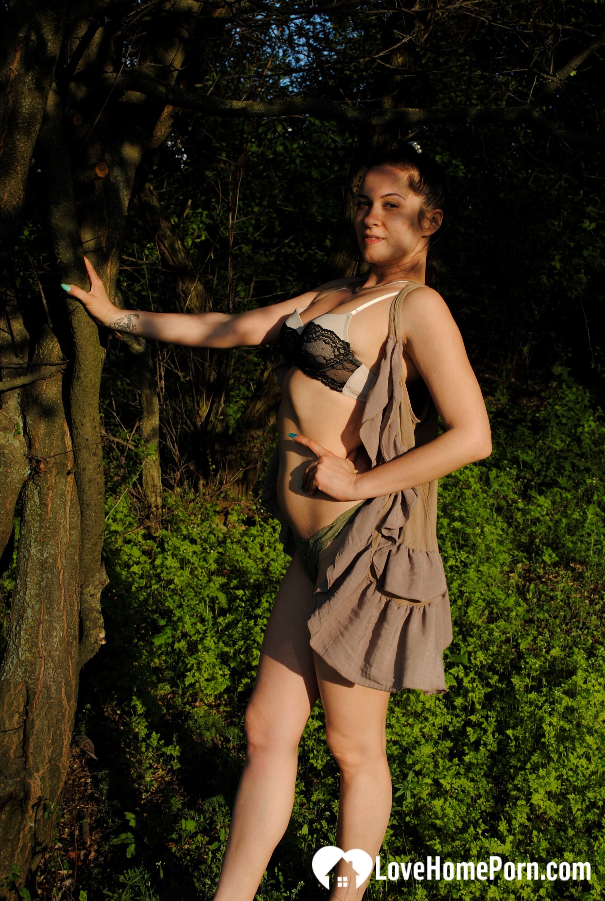 Beautiful brunette with a tattoo teases outdoors