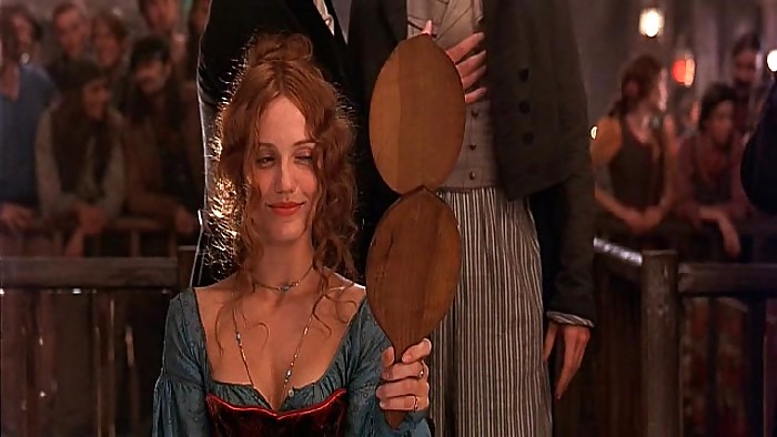 Cameron Diaz and a man fighting before they end up against a post and begin kissing and then having sex as the guy picks her up against the post. Near the beginning, Cameron's right nipple pops out of her dress as she swings at the dude. From Gangs of a New York.