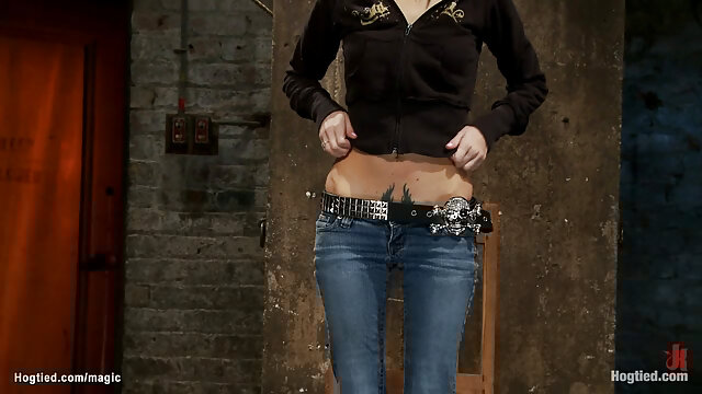 Slim blonde slave Rene Phoenix is bound in hogtie position over padded chest with hook in the ass and ball gag in mouth then pulled in the air by master Matt Williams
