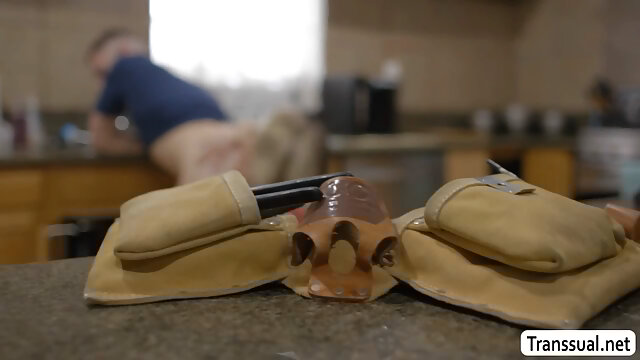 Busty TS gets horny while watching the guy fixing her pipe lines in the kitchen.She cant resist and she then licks the ass of the guy and next is,she fucks his ass so hard.After that,they move into the room and she then continue fucking his ass.