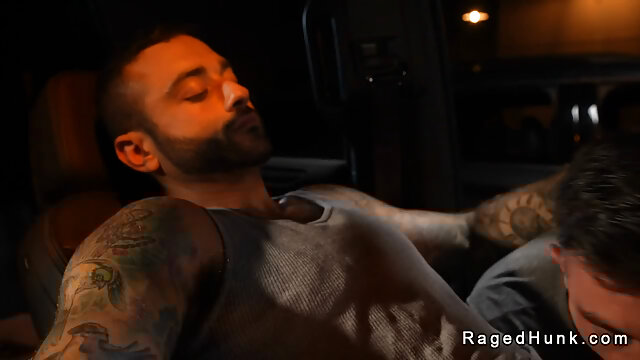 Drew Valentino gets blowjob on his big cock from Ian Holms while sitting behind the wheel hen rims and anal fucks him from behind balls deep till cums on his face