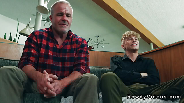 Stepbrother Dale Savage bent over counter young blonde gay Harley Xavier and rimmed his ass then with hard old dick anal fucked him from behind on the sofa