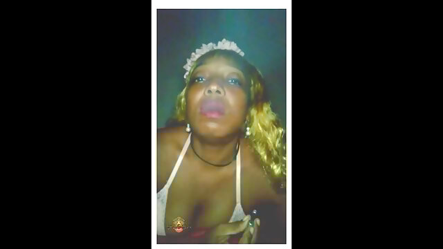 Ebony Goddess smokes a pipe wearing a pink bra and red lipstick.