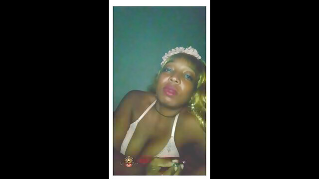 Ebony Goddess wearing pink bra smokes pipe and blows smoke with red full lips.
