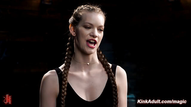 Tall sexy brunette slave Erin Everheart in a brutal predicament bondage with one leg tied and pulled up gets pussy vibrated then bound in folded position gets soles and pussy whipped by The Pope
